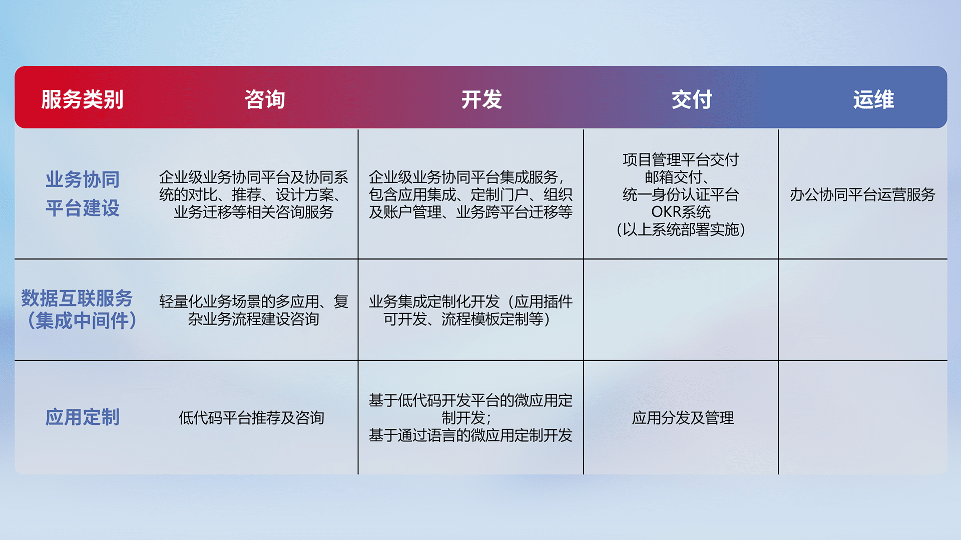 针对钉钉、、企微、、、、IDaas等平台级产品提供产品的规划、、方案、、交付、、、定制化开发等服务,,,实现如统一协同办公、、、智能客户服务、、混合会议管理、、、智能数据查询、、、等业务场景,,,,实现数字化转型。。